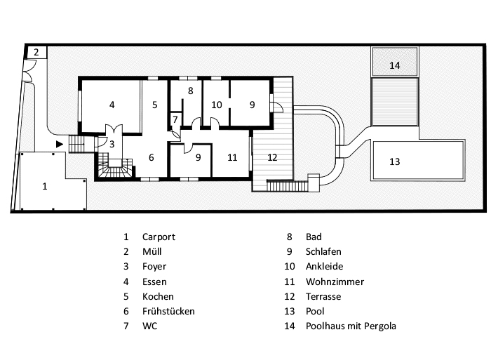 Die viel zu steile Einfahrt in die ehemalige Garage wurde zugeschüttet, stattdessen ein Carport im rechten Vorgartenbereich errichtet.