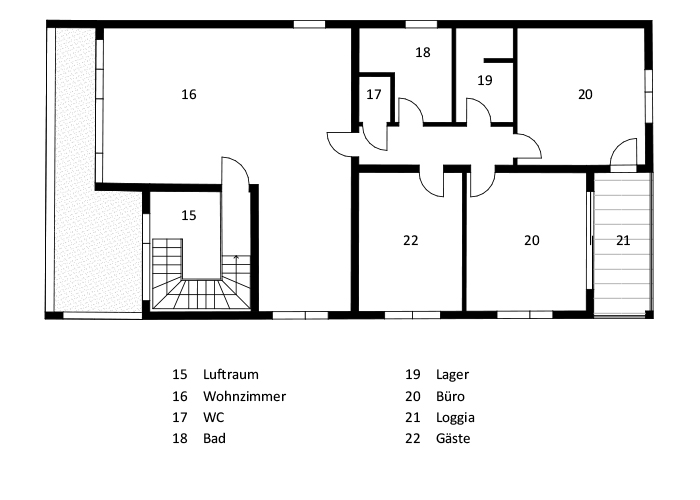 Zurückgezogen hinter ein kleines Bad zur Linken und ein Gästezimmer zur Rechten liegen die beiden, sich nach dem ruhigen Garten orientierenden Arbeitszimmer.